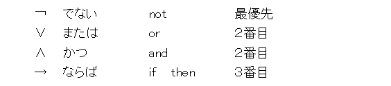 一応、日本語と英語の読み方と、作用する順序を書いておきました。順序を決めておくと、( )の省略ができて式が見やすくなります。なお、「でない」を「否定」と呼ぶことも多々あります(どっちを使うかは書いてるときの気分による)。