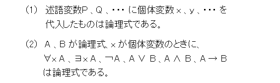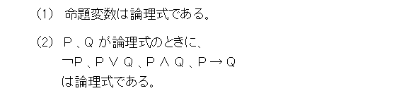 やっと本論に入れます(なんで、前置きがこんなに長くなったんだ)。まず、論理記号は用意しました。次に、無限に多くの命題変数を用意します。これは、p 、 q 、 r 、・・・ です。この上で、論理式を、