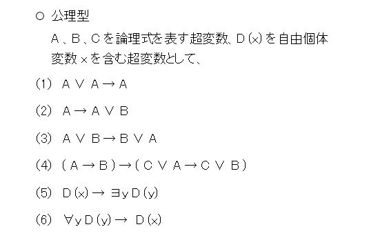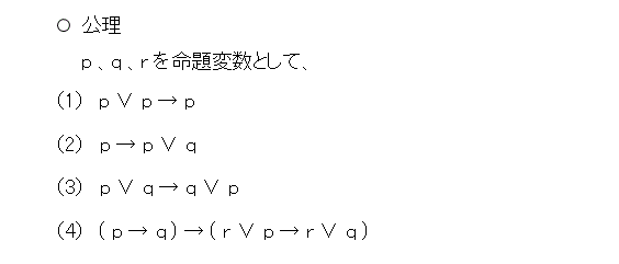 次は、公理です。公理は、それなりの体系ができるものであれば、なんでもよいのだけど、ここでは、天下り的に以下の公理を採用します。