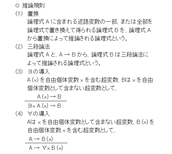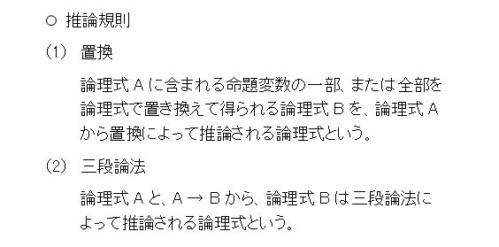 今度は、推論規則です。推論規則は、以下の「置換」と「三段論法」です。