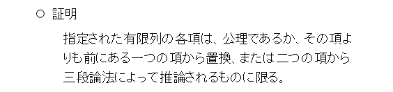 そして、証明の最後の論理式は、証明によって「証明される」と呼びます。とまあ、こうなんだけど、論理式を並べただけだと解りにくいので、説明文の挿入を許すことにします。もちろん、説明文は読む人が解るようにするためだけなので、形式的な処理や、機械的な処理をするときは無視されます。