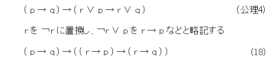 ところで、公理(4)を見ていると、どうしても、「 r 」を「 r でない」に置換したくなってきます。置換すれば、式(18)の証明ができますね。