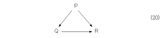 図式(20)を眺めると、PならばQと、QならばRとから、PならばRが出てくると予想されるでしょう(予想を立てるのはよいことです)。三段論法によって確かめましょう。QならばRと証明された式(19)に対して、三段論法を適用すると、