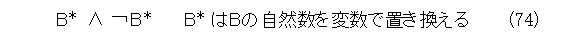 これで、L0+ での式(73)の証明から、LでMから式(74)が導けた訳ですね。しかし、Mは無矛盾としていたので、これは無矛盾に矛盾します。つまり、L0+ は無矛盾ですね。