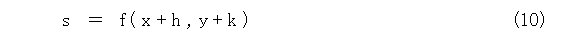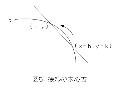 さて、法線について考えましょう。といっても、式(9)でどうすればいいのでしょうか。こんなときは、とりあえず変数をちょっと動かしてみるのが常套手段(じょうとうしゅだん)です。ここで、t は x と y の関数のように見えるので、 x と y をちょびっと動かすと、t もちょびっと動くと考えられますね。ここで、x と y をそれぞれ h 、k だけ動かして、そのときの値が、s になったとしましょう。つまり、図4と式(10)です。