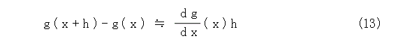 ここで、微分の意味を思い出しましょう。式(13)は、両辺を h で割って、極限を考えれば等しくなりますね。そういう意味で、式(13)は、h が微小のときの近似値になるという意味です。