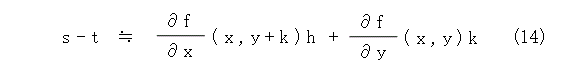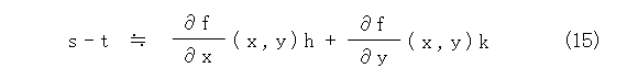 ということから、式(12)の右辺の一行目と二行目は、微分を使って近似できます。ただし、一行目は x で微分し( y を定数とみなして x で微分する)、二行目は y で微分します( x を定数とみなして y で微分する)。慣習に従って、偏導関数記号を使いましょう。すると、式(14)のようになります。