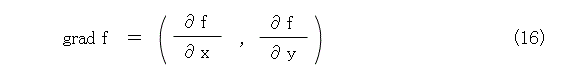 式(15)の左辺を式(11)の右辺で置き換えて、式(13)と見比べましょう。なんか気になりますね。この微分係数相当の部分を、式(16)のように書いて、勾配とか、グラジエント(gradient)と呼びます。ちなみに、式(16)の左辺は、グラジエント f とか、f のグラジエントと読みます。