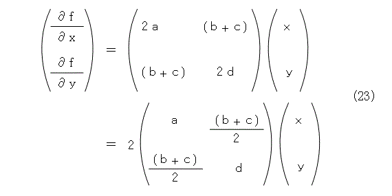 ここで注意というほどのことではないけれども、式(3)で b と c を入れ換えても右辺は変りません。それどころか、 b と c をどちらも、足して半分にしたものに置き換えても右辺は変りませんね。ただし、いずれの場合も、左辺の行列は変ります。つまり、2次形式が同じでも、それに対応する行列は色々あるということです。