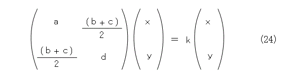 まず、同じ2次曲線になる行列は多数あります。しかも、2次曲線では、主軸は直交しています。ということから、ここでやった方法は、式(24)にあらわれるような行列(これを対称行列という)に対しては、固有値、および固有ベクトルを求めることが、2次曲線の簡単な表現と結びついているということです。そして、このときは、固有ベクトル方向に座標系を取ると、実は、行列の表現も簡単になります(対角行列になる)。対称行列では固有ベクトルが存在し、しかも直行することや、それでうまく対角化できることは、読者自身でやってみましょうね。