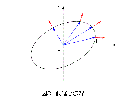 図3のように、楕円上に任意の1点Pを取ります。そして、動径OPと点Pで楕円の法線を考えましょう。Pを色々動かすと(だから動径というんだ)、大概の点では、動径OPと法線は、かくんと折れていますが、長軸と短軸のところでは、同じ向き(逆向き)になること(平行になるという)が解るでしょう。