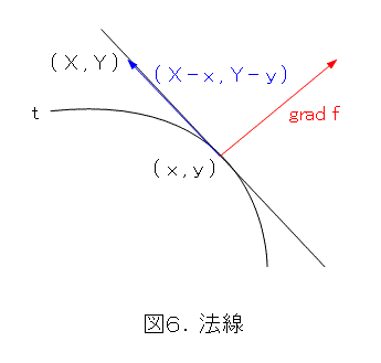 これから、grad f は接線に垂直となり、要するに法線となります。これで法線が求まりました。