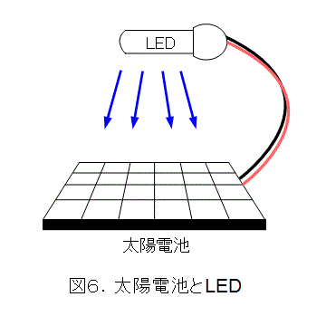 図5と図6を比較してみましょう(対比という)。発電機の代わりに太陽電池、モーターの代わりに LED 、ベルトの代わりに光、導線は同じですね。発想がよく似ています。そして、まったく同じように、太陽電池は効率が 100 % ではありませんし、 LED も効率が 100 % ではありませんし( LED って触ると結構熱いよね)、光も 100 % 完全に LED に集められませんし(完全な真空とか、完全な反射をする鏡なんて無理です)、 100 % の効率の導線もありません。