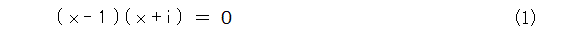 この方程式の解は、 1 、 - i ですね。しかし、式(1)を展開して、式(2)の形で出題されたらどうでしょう。ちょっと解かり難くなりましたね。受験テクニックで鍛えた人なら、たちどころに因数分解して式(1)とし、解を出すでしょう。
