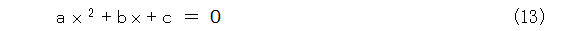 まず、2次方程式を一般形で書いた式(13)を用意します。もちろん a は 0 ではありません(いつものことで、以後、この手の文字に対する制限は書きません)。