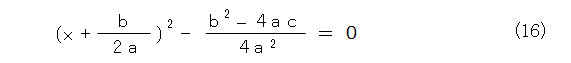 ここで、式(14)を使うには、式(16)の後ろの項がなんかの2乗になればよいわけです。そこで、式(16)の後ろの項を式(17)のようになっているとすれば、式(14)が適用できて、2次方程式の解の公式が得られます。