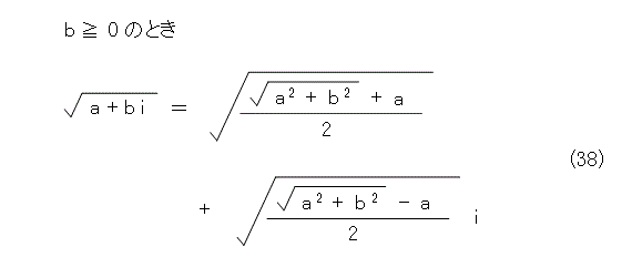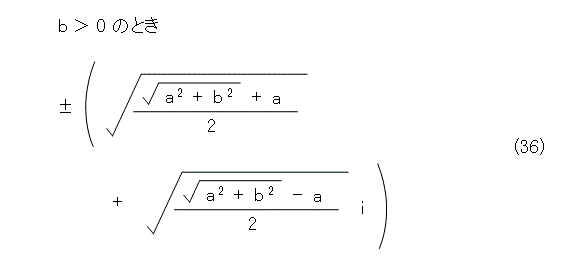 b を 0 として、式(36)の項の中をよくみると、 a が正であれば、第2項が消え、 a が負であれば第1項が消えます。そして、計算するまでもなく、明らかに、式(29)の平方根は、式(36)そのものです。つまり、 b が 0 になるときは、式(36)に繰り込められます。