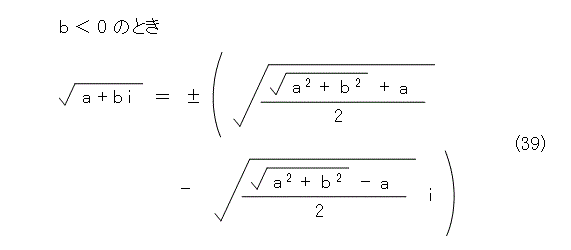 つまり、平方根号として式(39)の+の方と、−の方のどちらを取ってもよいことになりますね。変な気がするかもしれないけど、実数の時には適用できないので、どうでもよいということです。