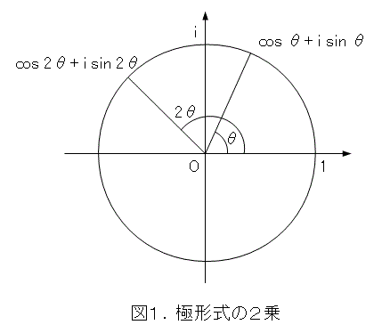 図を描くとき、 r はうっとうしいので、無視しましょう。ちなみに、 r を絶対値とか、長さとか、ノルム、 θ を偏角と呼びます。さて、元の複素数と、その2乗を図示すると、図1のようになります。