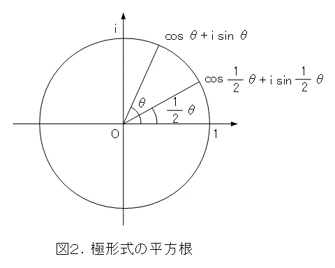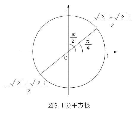 少し試してみましょう。 i の平方根を考えてみます。このときは、図3に書いてある2個の複素数を2乗すると、本当に i になっていることが、簡単な計算で確かめられます。
