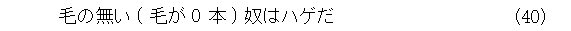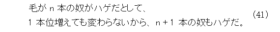 ついでに、「ハゲ」の代わりに、「ビンボー」にして、「毛」の代わりに「お金」とすれば、全ての人類が「ビンボー」になるとの証明ができます。他にも、色々使えるので、後は自分で考えましょう。
