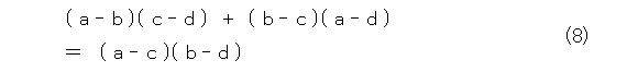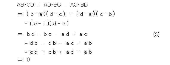 さて、平面上の点は複素数に対応することと、式(4)の恒等式は、四則演算しか用いてないので、当然、複素数でも式(4)は成り立ちます。そこで、各点A、B、C、Dに対応する複素数をそれぞれ、 a 、 b 、 c 、 d としても成り立ちます。