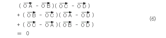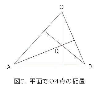 最初に、式(7)は、特に次元とは関係なく成り立つので(成分を使って計算したものではないから)、平面のベクトルでも成り立ちます。そこで、4点の配置が図6のような場合を考えてみましょう。