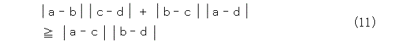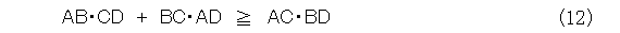 以上から、式(23)が成り立つのは、四角形が円に内接しているときに限ることがわかりました。この部分、つまり、平面上の相異なる4点A、B、C、Dについて式(12)の等号が成り立つ場合、つまり、式(1)が成り立つときに、4点A、B、C、Dは円に内接する四角形ABCDとなります。これがトレミーの定理です。