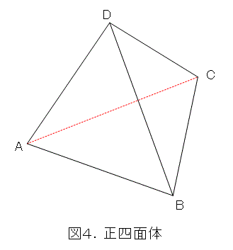 こういうとき、まずは、都合のよさそうな図形を考えてみるものです。例えば、正四面体です。