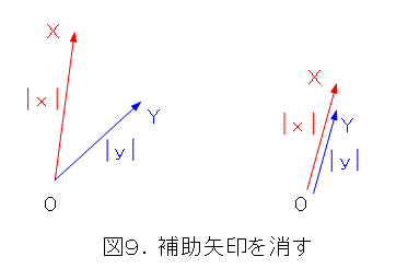 図8から、式(15)が成り立つのは、点O、X、Yが同一直線上にあるときだとわかります。しかし、和は、見た瞬間にわかるものではなく、作図しないとどこだかわかりませんね。