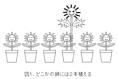 例えば、7本の植物を6個の鉢に植えようとすると、どれかの鉢は2本の植物を植えなくてはなりませんね。