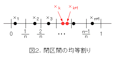 図2では、閉区間 [ 0 , 1 ] を n 個に部屋割りするようなフリして、 n 個の閉区間に分割しており、各区間の端点が共有されています。無理矢理半開区間にするという手もなくはないが、これだと区間の端点の扱いが面倒なのでやりたくありません。