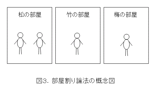 1つの席に対して2人の人がいれば、どちらか1人があぶれるか、2人で1つの席に座るしか手はありません。これは、子供でもよく経験しています。このことから、部屋割り論法は、感覚的に解かりやすい、簡単な論法です。しかし、こんな部屋割り論法が意外と役立つということを見てきました。これから、感覚的によく感じていることでも、よく考えると、色々と使え、役に立つものがあるといえるでしょう。もちろん、いつでもうまくいくとは限りませんが、身近にある単純なことや方法をよく考えてみるのは面白いし、よい思考訓練になります。この点、本稿を読まれた方はどうお考えでしょうか。