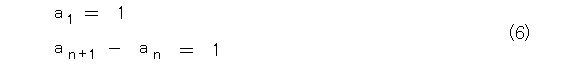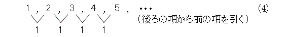 さて、数列を考えていく上で、一番簡単な数列は式(1)や式(2)でしょう。まあ、どっちでもよいので、式(2)の方で考えて行きます。なお、今回、自然数といったら、1からということにします。そうすると、自然数は、1から始めて、1ずつ増えて行くので、一つ前の項を引くと式(4)のようになります。