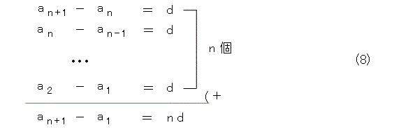 式(7)は基本的な数列と考えられるでしょう。これは、初項 a 、項差 d の等差数列ですね。ここから一般項を求めるには、式(7)をずらして並べ、その総和をとります。