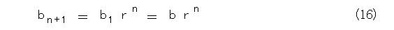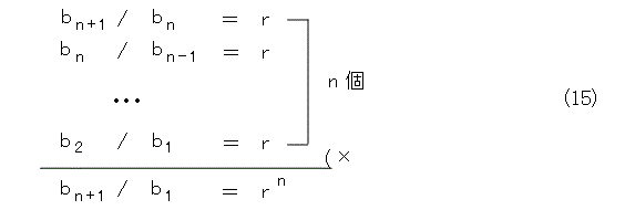 式(14)は、初項 b 、項比 r の等比数列ですね。ここから一般項を求めるには、式(14)をずらして並べ、その総積をとります。
