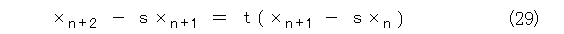 どうやって一般項を求めましょうか。式(28)は3項の関係式なので、何らかの方法で、2項の関係式に落とせばなんとかなる可能性が出てきますね。それで、式(21)を参考にして、式(29)のように置いてみましょう。