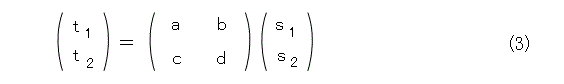 式(2)の連立方程式は、ごちゃごちゃしているように見えますが、行列を使って書き直すと式(3)のように見やすくなります。