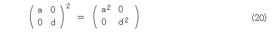 やっぱり、グチャグチャですね。複雑過ぎて手が出ないときは、簡単なもので様子をみるのが手です。一番簡単なものはゼロ行列(成分が全部 0 )で、次に簡単と思われるのは単位行列です。これらは2乗しても同じ行列になります。その次に簡単なのは対角行列でしょう。実際に2乗してみます。