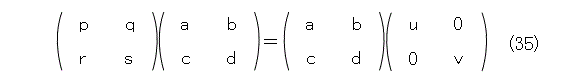 式(32)を固有方程式、その解を固有値と呼びます( t についての方程式)。更に、式(32)は2次方程式で、その解は、 u 、 v であり、式(23)から、行列を対角化すると、固有方程式の解が対角成分に並ぶということが見て取れます。なお、式(32)の左辺を計算すると、式(14)のただし書きから、 u 、 v とも 0 ではありません。自分で確かめましょう。