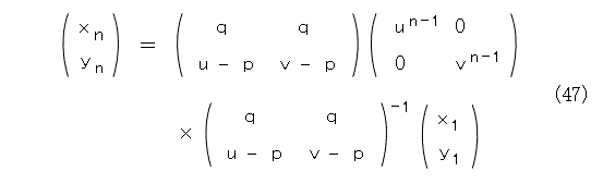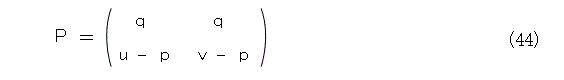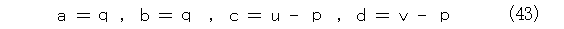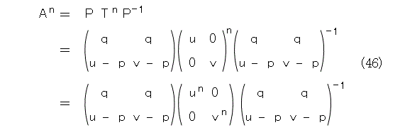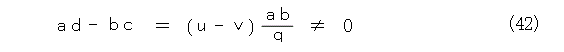 これから、 u と v は異なること、つまり固有方程式(32)は異なる解であるときに、Pは逆行列を持つことが解かります。そして、式(37)、式(38)、式(39)、式(40)を満たすように、たとえば、式(43)みたいに、 a 、 b 、 c 、 d を選びます。