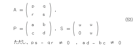 これは、式が4本に見えますが、式(37)と式(39)は固有方程式(32)の解が u であることから同じ方程式になります(たとえば、式(37)を c について解いて、式(39)の左辺から右辺を引いたものに c を代入し、固有方程式(32)の解が u であることを使えば 0 になるから)。式(38)と式(40)も同様です。したがって、実際は式(37)と式(38)の2本だけです。これから、適当に、 a 、 b 、 c 、 d を選べばPが作れます。ただし、Pが逆行列を持つことから、式(34)が成り立たねばなりません。