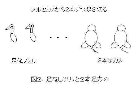 この問題を解くのに使われるのが、ツルカメ算という残虐非道な方法です。まず、ツルとカメから足を2本ずつ切り落としてしまいます(こんなことをしたら怒られるよな)。
