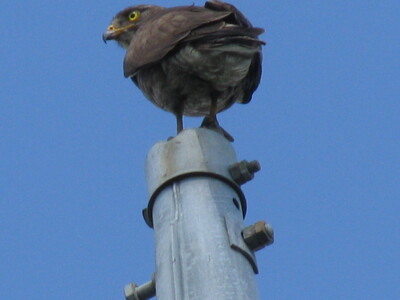 これも偶然、サシバと思われる奴が電柱に止まっているときに撮れた写真だ。どっかの町のマスコットキャラにサシバのサッちゃんなんてのがいたなー。それにしても、トビは異様に嫌われていて、トンビのトンちゃんのように呼ばれ、可愛がられているという話は聞かないなー。感じとして、トビはどこにでもいるし、人間を襲って食べ物を奪っているからだろうか。ちなみに、このノリからして、写真2のドブガモは、ドブガモのドブちゃんでいいかな。