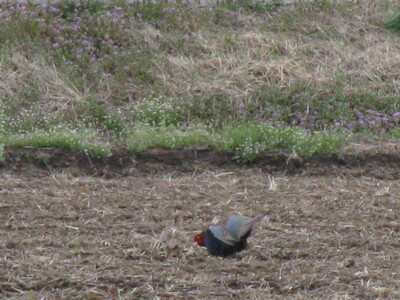 偶然とはいえ、こんな写真も撮れた。すけべおっさんキジが、若いねーちゃんキジをナンパしてる写真だ。キジのオスが、体を膨らませてナンパをしている。この写真を見て、すぐにメスを見つけられるかな。今まで、見せた奴らは、どこにメスがいるのかわからず、探しまくっていた。キジの目撃例は、オスに比べてメスが極端に少ない。大体は、道を横切るときとか、緑の草むらにいるときとか、そんなものばかりだ。しかし、この写真を見れば、目撃例が少ないのは納得できるだろう。いても見えないからと思われる。