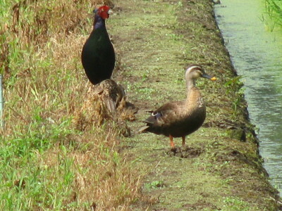 こんな写真もある。キジの夫婦(こいつら本当に夫婦か)とドブガモが仲良く一緒にいる。キジのオスとドブガモって仲がいいのか、ということは別として、どこにキジのメスがいるかわかるかな。