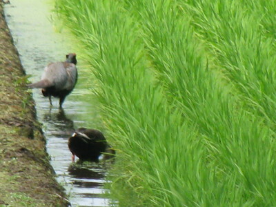 以下の写真は、見ての通り、ドブガモとキジのオスが一緒に田んぼに入って何かをつっついている。それにしても、キジも田んぼに入るのか。畑の上や、田んぼのあぜ道を歩いているのはよく見かけるけど、田んぼに入るの初めて見た。