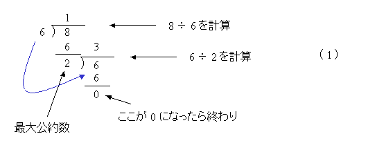 ここまでくれば、計算方法の見通しが立ちます。小さい方で大きい方を割ってその余りを求め、以下割りきれるまで、その余りで一つ前の余りを割っていけばいいわけです。