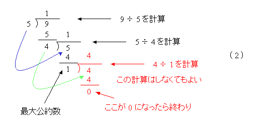 まず、9÷5の余りを計算します。これは4です。次に、5÷4の余りを計算します。これは1です。続いて、4÷1の余りを計算します。割りきれますので、この一つ前の余り1が最大公約数になります。(2)の計算をよくながめてみましょう。ところで、1で割ったら割りきれるに決まってますから、赤字で書いた部分は不要です。余りが1になった段階で計算を打ち切って、「互いに素」としても全く問題ありません。