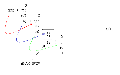 機械的に計算して、13が最大公約数だと解ります。これはこれでいいのですが、念のために最大公約数になっていることを確かめましょう。まず、338 = 13×26、715 = 13×55なので、確かに13は公約数になっています。後は、338と715の約数を全て書き出せば、確かに最大公約数だと解ります。が、書き出すのは面倒です。次の章で、書き出さなくても済む方法を述べます。